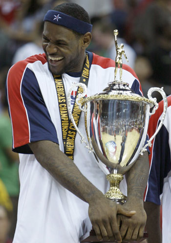 Team USA's LeBron James holds the championship trophy after they defeated Argentina to win the FIBA Americas regional qualifying basketball tournament to decide two berths for the 2008 Beijing Olympics, in Las Vegas, Nevada September 2, 2007. [Reuters] |