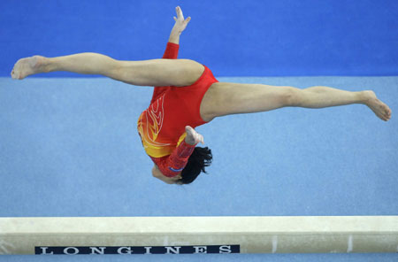 Cheng Fei of China performs her routine during the team event at the 40th World Artistic Gymnastics Championships in Stuttgart September 1, 2007. [Reuters]