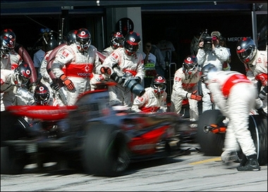 Driver Fernando Alonso drives into the pits in Istanbul in August 2007. The McLaren-Mercedes Formula One team has been fined 50,000 dollars by motor sport's ruling body (FIA) for failing to crash test a new gear box prior to Fernando Alonso's victory in Hungary. [AP] |