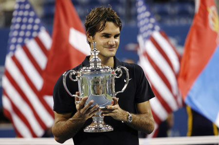 Roger Federer of Switzerland poses with the trophy after winning his match against Novak Djokovic of Serbia in the men's final of the US Open tennis tournament in Flushing Meadows, New York, September 9, 2007. [Reuters] |
