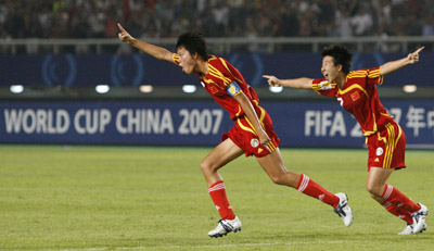 | China's Li Jie (L) celebrates scoring a goal with team mate Bi Yan during the group match in the 2007 FIFA Women's World Cup against Denmark at the Wuhan Sports Centre Stadium September 12, 2007. China beat Denmark 3-2. [Reuters] |