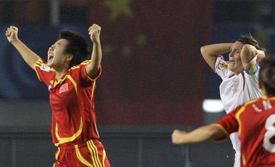 | China's Bi Yan (L) celebrates scoring a goal off a deflection from Denmark's Katrine Pederson (R) during their group match in the 2007 FIFA Women's World Cup at the Wuhan Sports Centre Stadium September 12, 2007. China beat Denmark 3-2. [Reuters] |