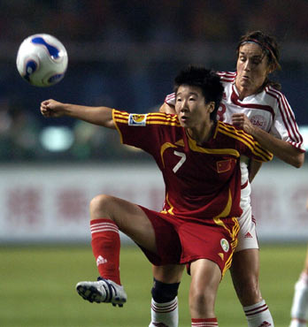 | China's Bi Yan (R) reaches for the ball during a group match against Denmark in the 2007 FIFA Women's World Cup at the Wuhan Sports Centre Stadium September 12, 2007. China beat Denmark 3-2. [Reuters] |