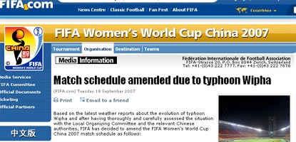 Updated: 2007-09-18 17:07 SHANGHAI, China - Typhoon Wipha, potentially the strongest to hit East China in a decade, has forced the rescheduling of two women's World Cup matches.