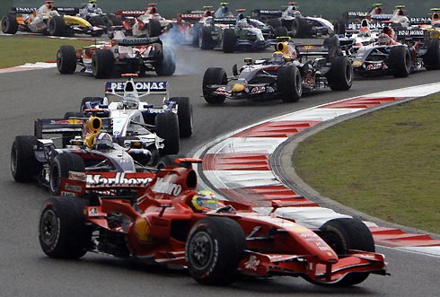 Toyota Formula One driver Ralf Schumacher from Germany (top) spins at the start of the Chinese F1 Grand Prix in Shanghai October 7, 2007. [Reuters]