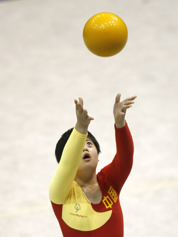 China's Feng Ji performs during the artistic gymnastics competition at the 2007 Shanghai Special Olympics Games October 8, 2007. Feng won one gold, one silver and two bronzes. [Xinhua] |