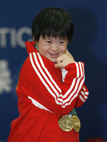 China's Feng Ji poses with her medals during the awarding ceremony after the artistic gymnastics competition at the 2007 Shanghai Special Olympics Games October 8, 2007. Feng won one gold, one silver and two bronzes. [Xinhua] |