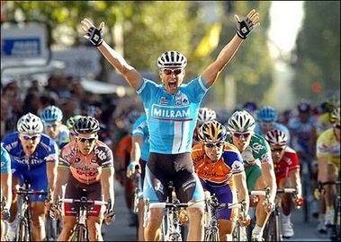 Italian sprint ace Alessandro Petacchi (C) of the Milram team celebrates as he wins the 101st edition of the Pro Tour Paris-Tours classic. [Agencies] |