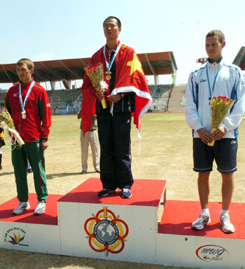 China's Cui Zhide (C), Ivan Trotski of Belarus (L) and Mapi Toth of Slovenia pose on the podium after men's 20 kilometers walk race at the 4th Military World Games in Hyderabad of India October 15, 2007. Cui won the race 1:23:31. [Xinhua] |