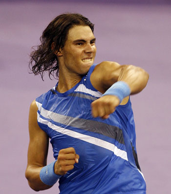 Rafael Nadal of Spain celebrates winning against Britain's Andy Murray after their match at the Madrid Masters Series tennis tournament in Madrid October 18, 2007. [Agencies] |