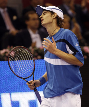 Britain's Andy Murray reacts after losing a point against Rafael Nadal of Spain during their match at the Madrid Masters Series tennis tournament in Madrid October 18, 2007. [Agencies] |