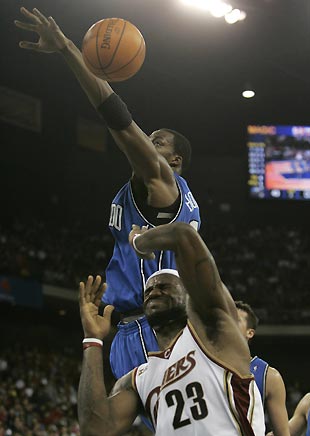 Dwight Howard of the Orlando Magic (top) blocks a shot during their NBA China Games basketball match in Macao October 20, 2007. LeBron James of the Cleveland Cavaliers is in front of Howard. The Magic won the game 100-84. [Reuters]