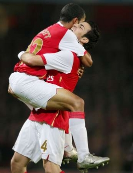 Arsenal's Theo Walcott (L) celebrates with team mate Cesc Fabregas after scoring against Slavia Prague during their Champions League Group H soccer match at Emirates Stadium in London October 23, 2007. [Agencies] |