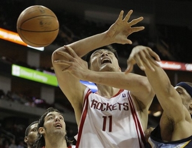 Houston Rockets' Yao Ming (11), of China, is fouled by Memphis Grizzlies' Andre Brown, right, during the third quarter of a preseason basketball game Tuesday, Oct. 23, 2007 in Houston. [Agencies] |