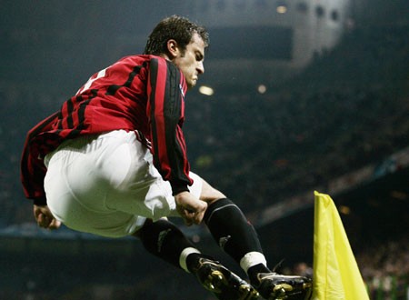 AC Milan's Alberto Gilardino celebrates after scoring his second goal against Shakhtar Donetsk during their Champions League Group D soccer match at San Siro stadium in Milan October 24, 2007. [Agencies] |