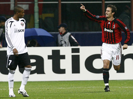 AC Milan's Alberto Gilardino (R) celebrates after scoring as Shakthar Donetsk's Fernandinho looks on during their Champions League Group D soccer match at San Siro stadium in Milan October 24, 2007. [Agencies] |