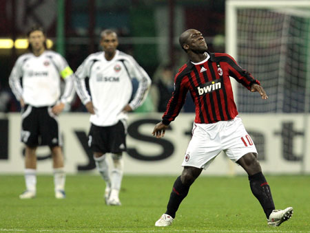 AC Milan's Clarence Seedorf celebrates after scoring the team's fourth goal against Shakhtar Donetsk during their Champions League Group D soccer match at San Siro stadium in Milan October 24, 2007. [Agencies] |