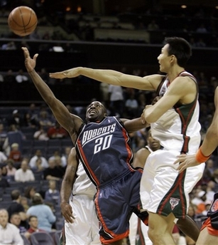 Charlotte Bobcats guard Raymond Felton (20) tries to shoot over Milwaukee Bucks forward Yi Jianlian (right) of China, in an NBA basketball game in Charlotte, North Carolina, November 2, 2007. [Agencies]
