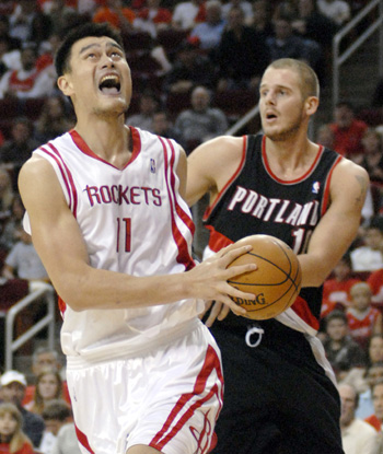 Houston Rockets' Yao Ming (11), of China, drives past Portland Trail Blazers' Joel Przybilla (10) in the first quarter of their NBA basketball game in Houston November 3, 2007. Rockets beat Blazers 89-80. [Agencies]