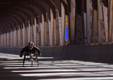 A participant in the wheelchair division crosses the Queensboro Bridge during the New York City Marathon November 4, 2007. [Agencies]