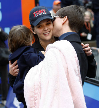 Actress Katie Holmes (C) is greeted by her husband Tom Cruise holding their daughter Suri after Holmes finished the 2007 New York City Marathon in New York November 4, 2007. [Agencies]