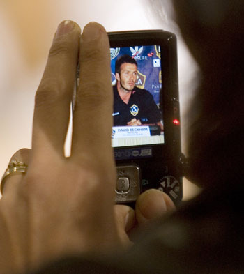 A reporter takes photographs of David Beckham of the Los Angeles Galaxy during a news conference in Vancouver, British Columbia November 6, 2007. The team will play the Vancouver Whitecaps in an exhibition soccer match on Wednesday. [Agencies]