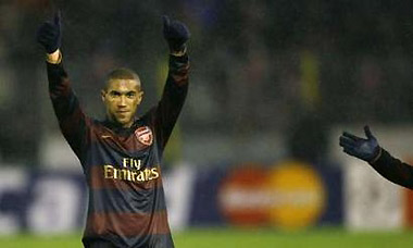 Arsenal's Gael Clichy acknowledges fans after their Champions League Group H soccer match against Slavia Prague in Prague November 7, 2007. [Agencies]