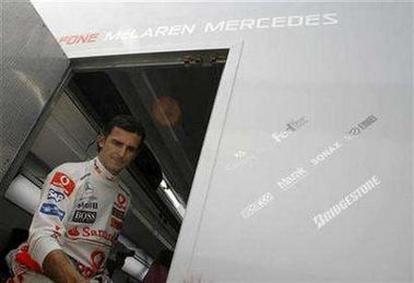 McLaren Formula One test driver Pedro Martinez de la Rosa of Spain exits a team truck during a training session at the Jerez racetrack, southern Spain September 20, 2007. De la Rosa said on Wednesday that he dreamed of inheriting compatriot Fernando Alonso's vacant seat at the Formula One team next season. [Agencies]