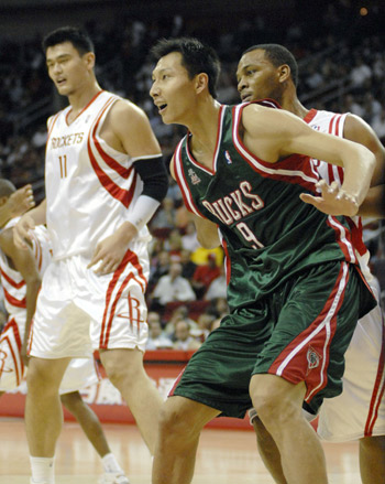 Milwaukee Bucks Yi Jianlian (R) of China calls for the ball as Houston Rockets' Yao Ming (L) plays behind him in the first quarter of their NBA basketball game November 9, 2007. [Agencies]
