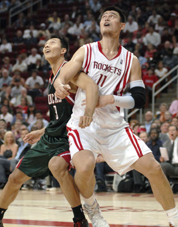 Milwaukee Bucks Yi Jianlian (L) of China and Houston Rockets' Yao Ming (R) fight for a rebound in the fourth quarter of their NBA basketball game November 9, 2007. The Rockets beat the Bucks 104-88. [Agencies]