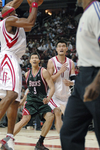 Milwaukee Bucks Yi Jianlian (L) of China and Houston Rockets' Yao Ming (R) battle for position in the fourth quarter of their NBA basketball game November 9, 2007. The Rockets beat the Bucks 104-88. [Agencies]