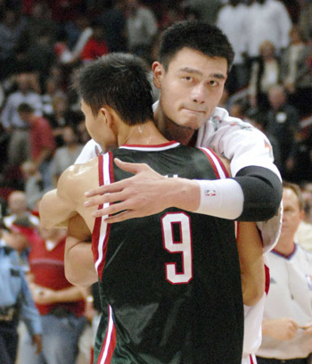 Milwaukee Bucks Yi Jianlian (L) of China gets a hug from Houston Rockets' Yao Ming (R) after their NBA basketball game November 9, 2007. The Rockets beat the Bucks 104-88. [Agencies]