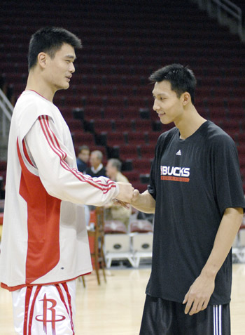 Houston Rockets' Yao Ming (L) and Milwaukee Bucks' Yi Jianlian (R) of China shake hands before their NBA basketball game November 9, 2007. [Agencies]