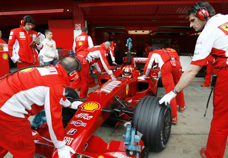 Michael Schumacher is surrounded by mechanics as he sits in Ferrari's car during a training session at Catalunya's racetrack in Montmelo, near Barcelona, November 14, 2007. Schumacher came out of retirement to test Ferrari's title-winning 2007 Formula One car in Barcelona. [Agencies]