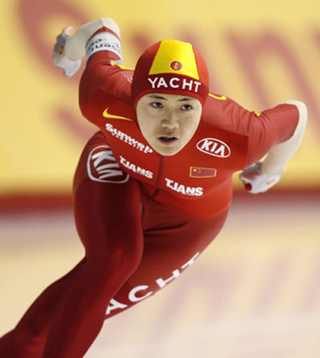 Wang Beixing of China skates to a second place finish in the woman's 500m race during the 2007 ISU World Cup Speed Skating Championships at the Calgary Olympic Oval in Calgary, Alberta, November 16, 2007. [Agencies]