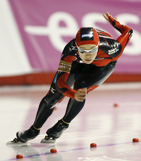 Sayuri Yoshii of Japan skates to a third place finish in the woman's 500m race during the 2007 ISU World Cup Speed Skating Championships at the Calgary Olympic Oval in Calgary, Alberta, November 16, 2007. [Agencies]