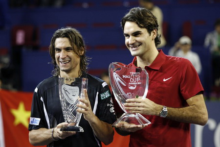 Roger Federer of Switzerland (R) and David Ferrer of Spain pose with their trophies as Federer wins and Ferrer finishes second at the Masters Cup tennis tournament in Shanghai November 18, 2007. [Agencies]