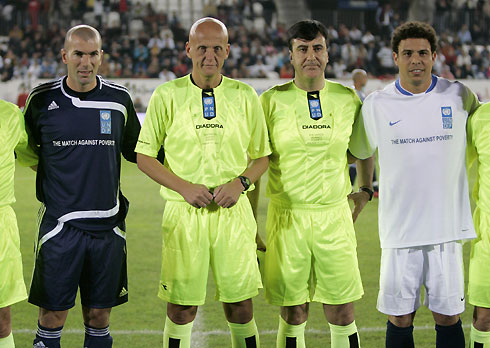 Zinedine Zidane (L) of France, referee Pierluigi Collina (2nd L) of Italy, referee Salvador Chirino (2nd R) and Ronaldo of Brazil pose before the fifth "Match against Poverty" in the Rosaleda stadium in Malaga, southern Spain November 19, 2007. As Goodwill Ambassadors for the United Nations Development Programme (UNDP), soccer stars Ronaldo and Zidane captained the teams made up of their invited friends in an effort to mobilise the public in the fight against poverty. [Agencies]