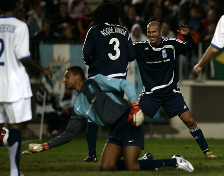 Zinedine Zidane (R) of France celebrates next to Roque Junior (C) after scoring during the fifth 'Match against Poverty' in the Rosaleda stadium in Malaga, southern Spain, November 19, 2007. As Goodwill Ambassadors for the United Nations Development Programme (UNDP), Ronaldo and Zidane captain the teams with their invited friends in an aim to mobilize the public in the fight against poverty. [Agencies]
