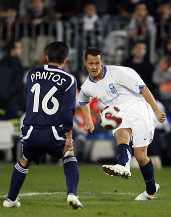 Formula One driver Michael Schumacher (R) of Germany kicks the ball next to Pantos during the fifth 'Match against Poverty' in the Rosaleda stadium in Malaga, southern Spain, November 19, 2007. As Goodwill Ambassadors for the United Nations Development Programme (UNDP), Ronaldo of Brazil and Zinedine Zidane of France will captain the teams with their invited friends in an aim to mobilize the public in the fight against poverty. [Agencies]