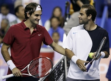 Pete Sampras, of the United States, right, smiles at Switzerland's Roger Federer before the start of an invitational exhibition tennis match in Kuala Lumpur, Malaysia, Thursday, Nov. 22, 2007. [Agencies]