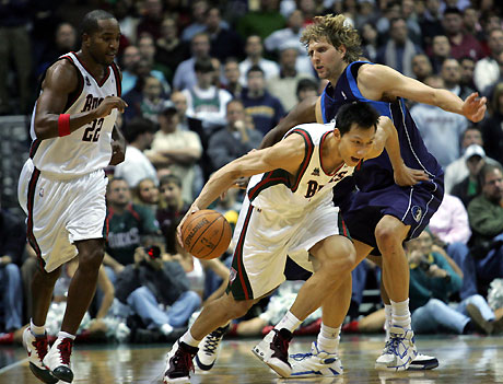 Milwaukee Bucks forward Yi Jianlian (C) from China is fouled by Dallas Mavericks forward Dirk Nowitzki (L) from Germany with 35 seconds left in the game during NBA action in Milwaukee, Wisconsin November 24, 2007. Bucks guard Michael Redd (22) watches the play, as the Bucks defeated the Mavericks 97-95 to go 6-0 on their home court this season. [Agencies]