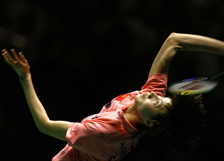 China's world number one Xie Xingfang returns a shot to Malaysia's world number nine Wong Mew Choo during their women's singles final game at the China Open Badminton Tournament in Guangzhou of South China November 25, 2007. The Malaysian won the title 2-1. [Xinhua]