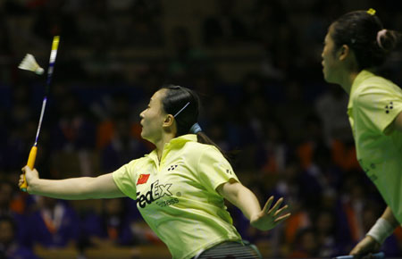 China's Zhao Tingting (L) and Gao Ling return a shot to compatriots Du Jing and Yu Yang during their women's doubles final game at the China Open Badminton Tournament in Guangzhou of South China November 25, 2007. Zhao and Gao won the game 2-1. [Xinhua]