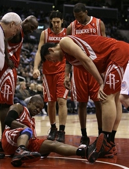 Houston Rockets', left to right, Mike James, Luis Scola, of Argentina, Tracy McGrady, and Yao Ming, of China, check on teammate Steve Francis after he fell to the floor on a foul by Los Angeles Clippers' Dan Dickau during the first half of an NBA basketball game, Monday, Nov. 26, 2007, in Los Angeles. [Agencies]