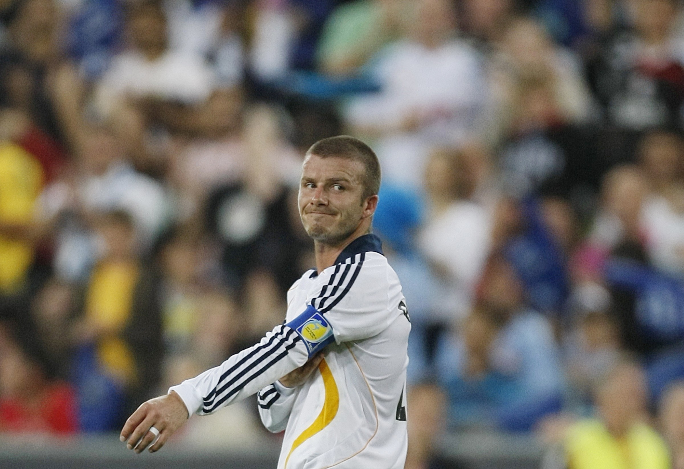 LA Galaxy captain David Beckham reacts in the final stages of a friendly soccer match against Sydney FC in Sydney November 27, 2007. [Agencies]