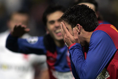 Steaua Bucharest's Valentin Badea reacts after scoring against Slavia Prague in their Champions League Group H soccer match at the Ghencea stadium in Bucharest November 27, 2007. [Agencies]