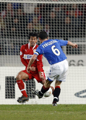 Glasgow Rangers' Barry Ferguson (R) scores a goal during their Champions League Group E soccer match against VfB Stuttgart in Stuttgart November 27, 2007. [Agencies]