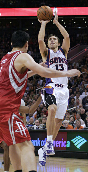 Phoenix Suns' Steve Nash (13) shoots and scores past Houston Rockets' Yao Ming (L) during fourth period NBA basketball action in Phoenix, Arizona November 28, 2007. Nash scored 29 points in the game. Houston defeated Phoenix 100-94. [Agencies]