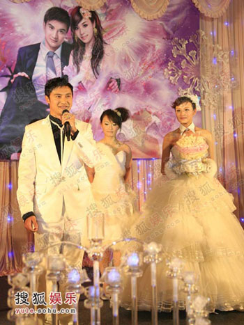 China's diving prince, 2000 and 2004 Olympic champion Tian Liang (R) and 2005 Super Girl contestant Ye Yiqian (L) are seen at their wedding ceremony in Shangri-La Hotel, Xi'an of Northwest China November 29, 2007. The pair's love story has been in spotlight in China since 2006. [sohu]